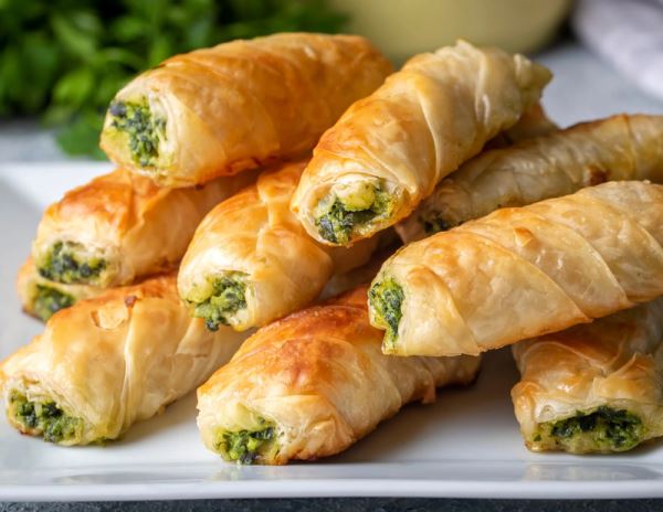 Шпинат быстро припустить на оливковом масле с чесноком, остудить и смешать с раскрошенной фетой, тесто раскатать, равномерно распределить начинку, свернуть рулетом, нарезать ломтиками и выпекать при 190 градусах 20 минут.