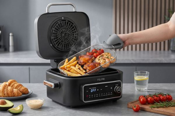 Эти и многие другие блюда можно легко и быстро приготовить на многофункциональном аэрогриле FELFRI FF-AF-10 «Мультишеф». Это полноценная кухонная станция, которая закрывает сразу несколько задач. Он совмещает функции гриля, пароварки, фритюрницы, хлебопечки и дегидратора, позволяя готовить практически все — от стейков и курицы до овощей на пару и сушеных фруктов.