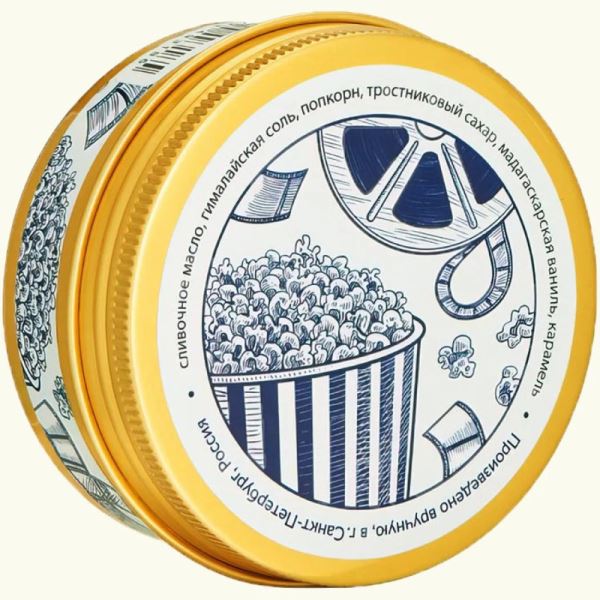 У этой свечи – сладкая композиция с нотами попкорна, карамели, ванили, топленого масла и тростникового сахара с легким соленым акцентом. Этот букет вызывает стойкую ассоциацию с кинотеатром. Свеча изготовлена в Санкт-Петербурге из чистого соевого воска, поэтому горение безопасно в том числе для детей и беременных.