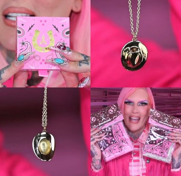 - Ожерелье в виде ковбойской шляпы с выгравированной подписью на цепочке длиной 21 дюйм. На задней стороне ожерелья изображен логотип Jeffree Star Cosmetics для тех, кто любит носить его задом наперёд.