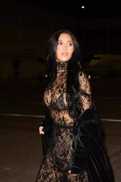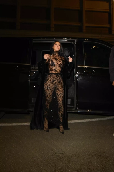 Для выхода в свет Кардашьян выбрала пикантный образ, надев полупрозрачное кружевное платье, которое сочетала с топом SKIMS. Звезда дополнила свой черный образ туфлями на каблуках от Balenciaga и завершила наряд эффектным черным пальто. Позже Ким поделилась видео из японского ресторана на крыше с захватывающим видом на Эйфелеву башню.