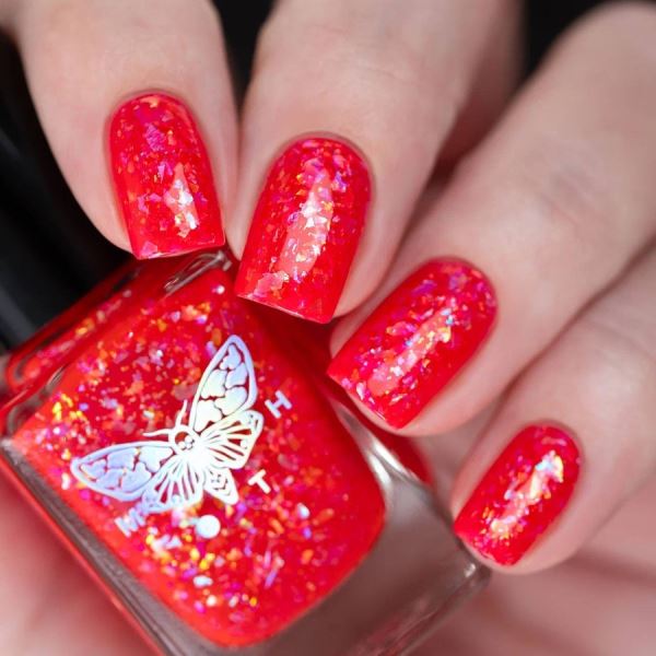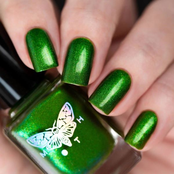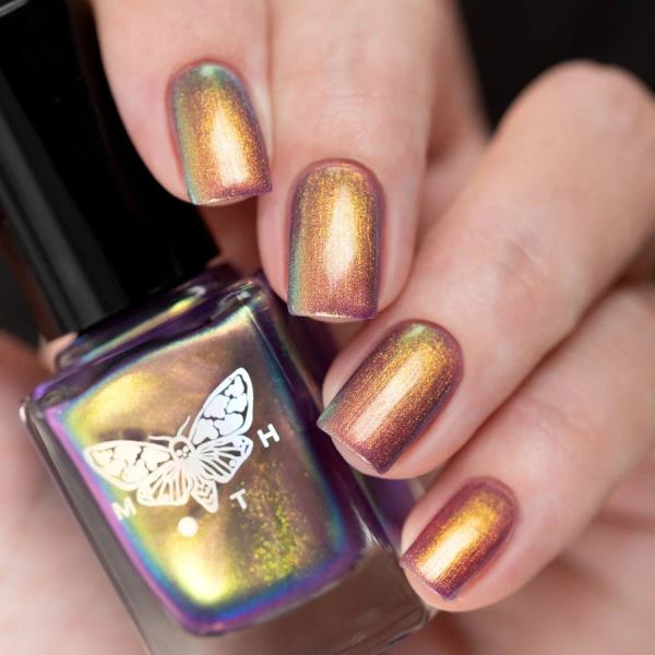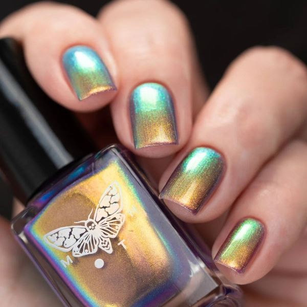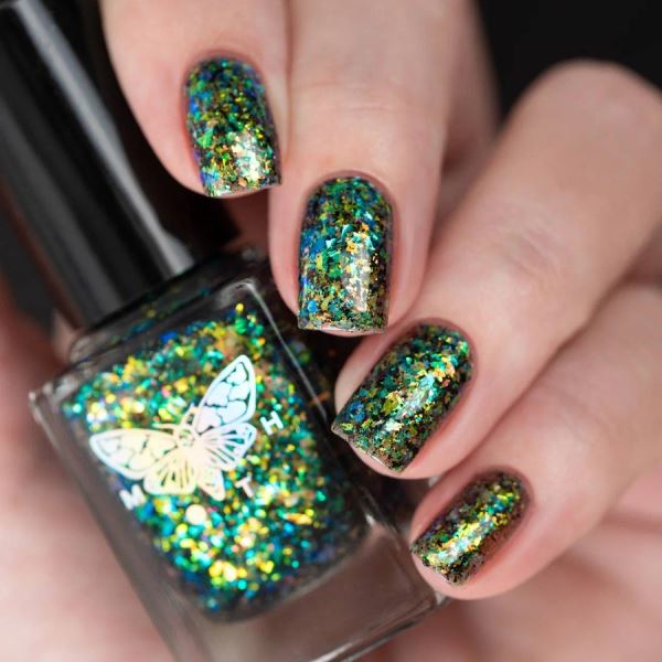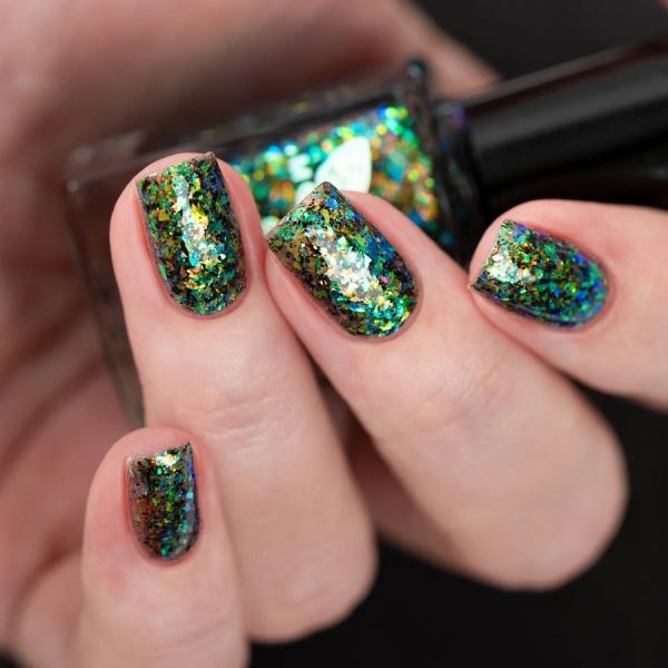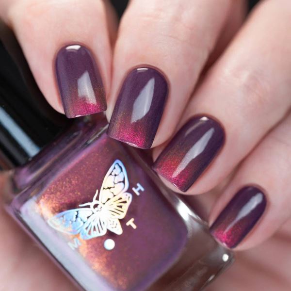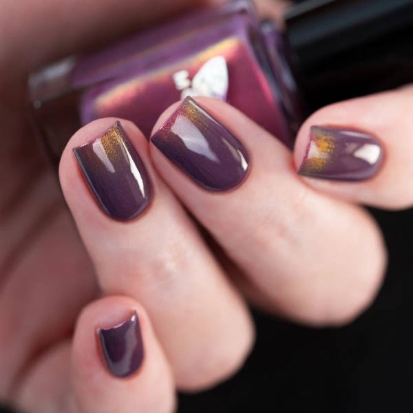 Неплотное фиолетово-бордовое желе с обилием золотисто-зелено-бирюзового шиммера.