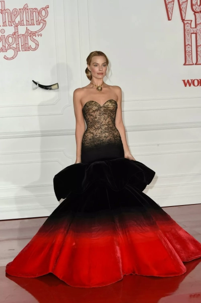На ковровой дорожке Марго сопровождал партнер по съемкам Джейкоб Элорди, сыгравший Хитклиффа. Актеры, которые вместе с выходом ленты активно провоцируют слухи о возможном романе, на лос-анджелесской премьере взялись за руки, чем произвели настоящий фурор.