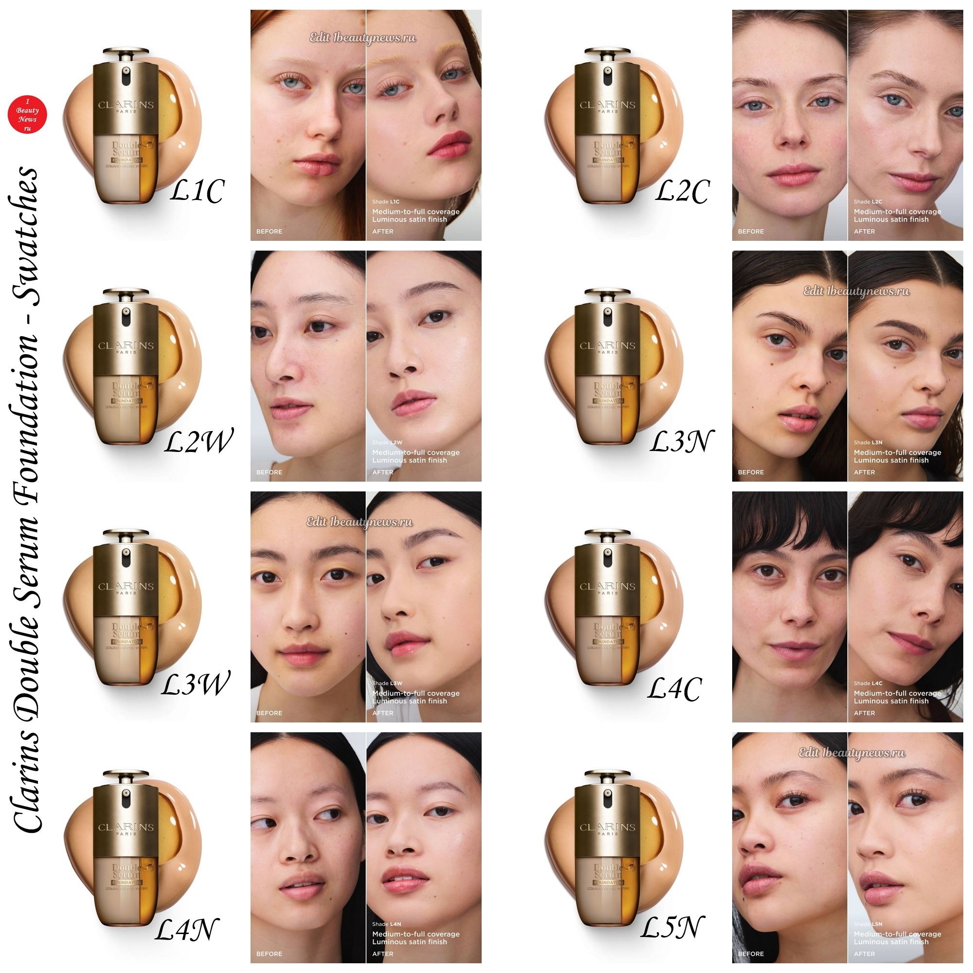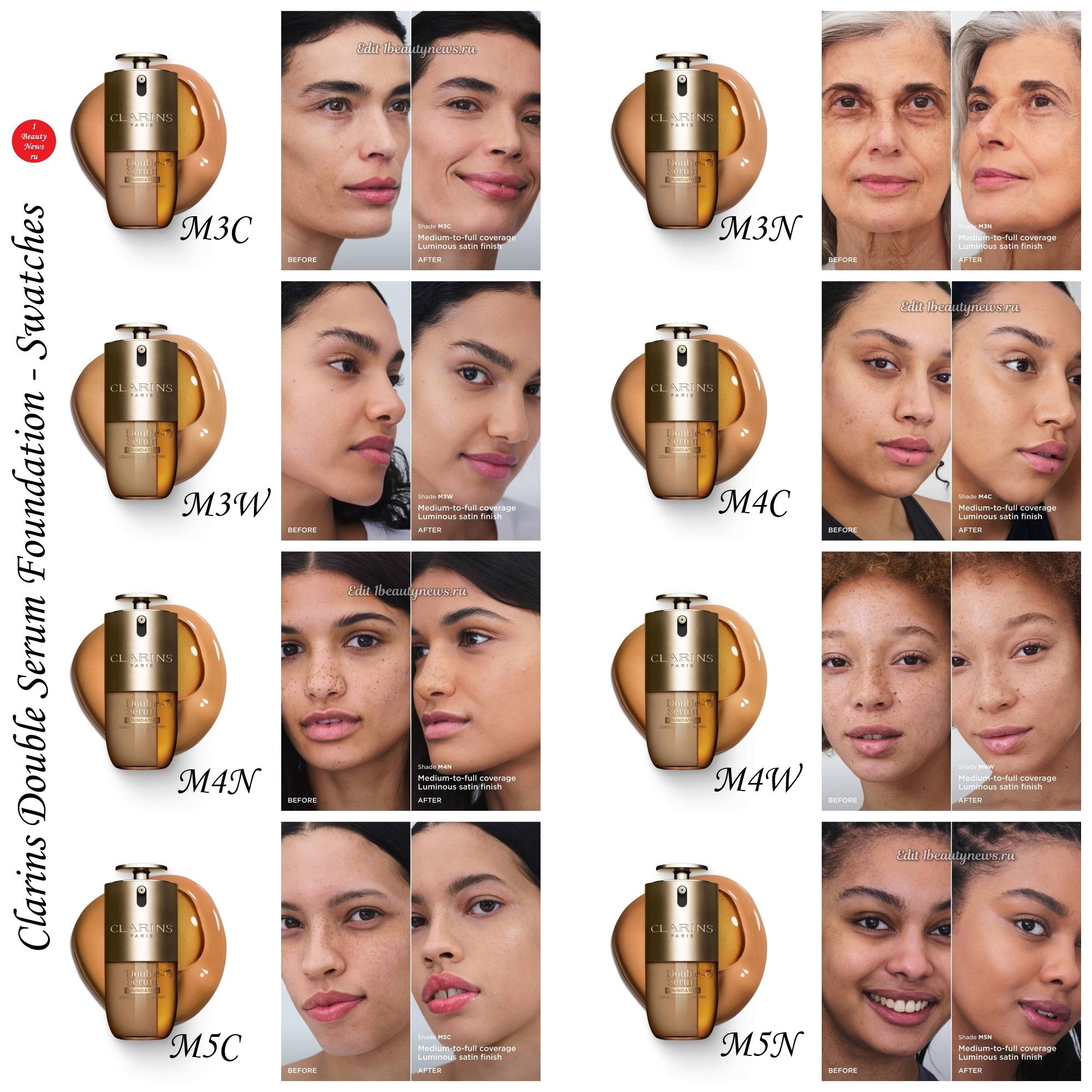 Новая тональная основа Clarins Double Serum Foundation вышла в широкой палитре из 37 оттенков для всех типов и тонов кожи (в России представлено 12):