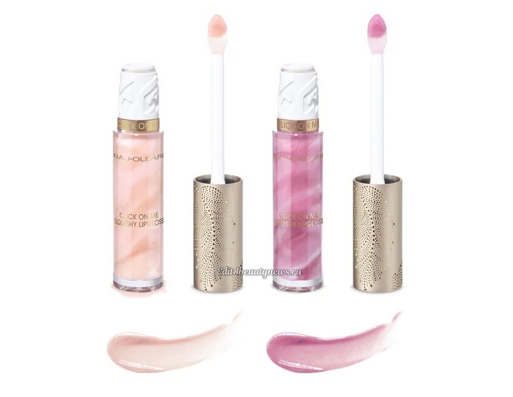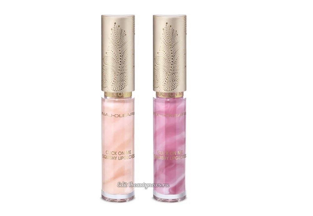 ✨ Блеск для губ Naj Oleari Click On Me Squishy Lip Gloss — звезда коллекции: ультраглянцевый блеск с мраморным узором и питательным маслом кунжута. Придает губам легкий оттенок с нежным ароматом карамели. Вышел в 2 оттенках: