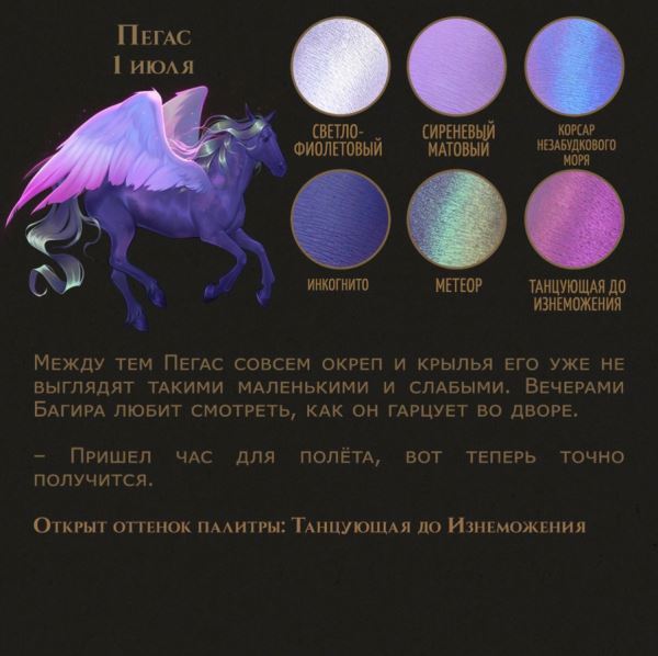 В утреннем тумане силуэт Пегаса виден четко. Его грива развевается на ветру, он бежит вдоль дороги и в какой-то момент раскрывает свои прекрасные крылья. Очень тихо, все ещё спят и, возможно, не скоро заметят, что Пегас научился летать.