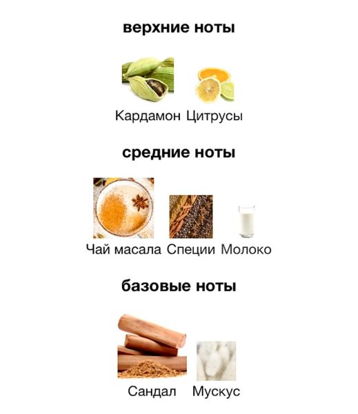 Средние ноты: Чай масала, Специи и Молоко.