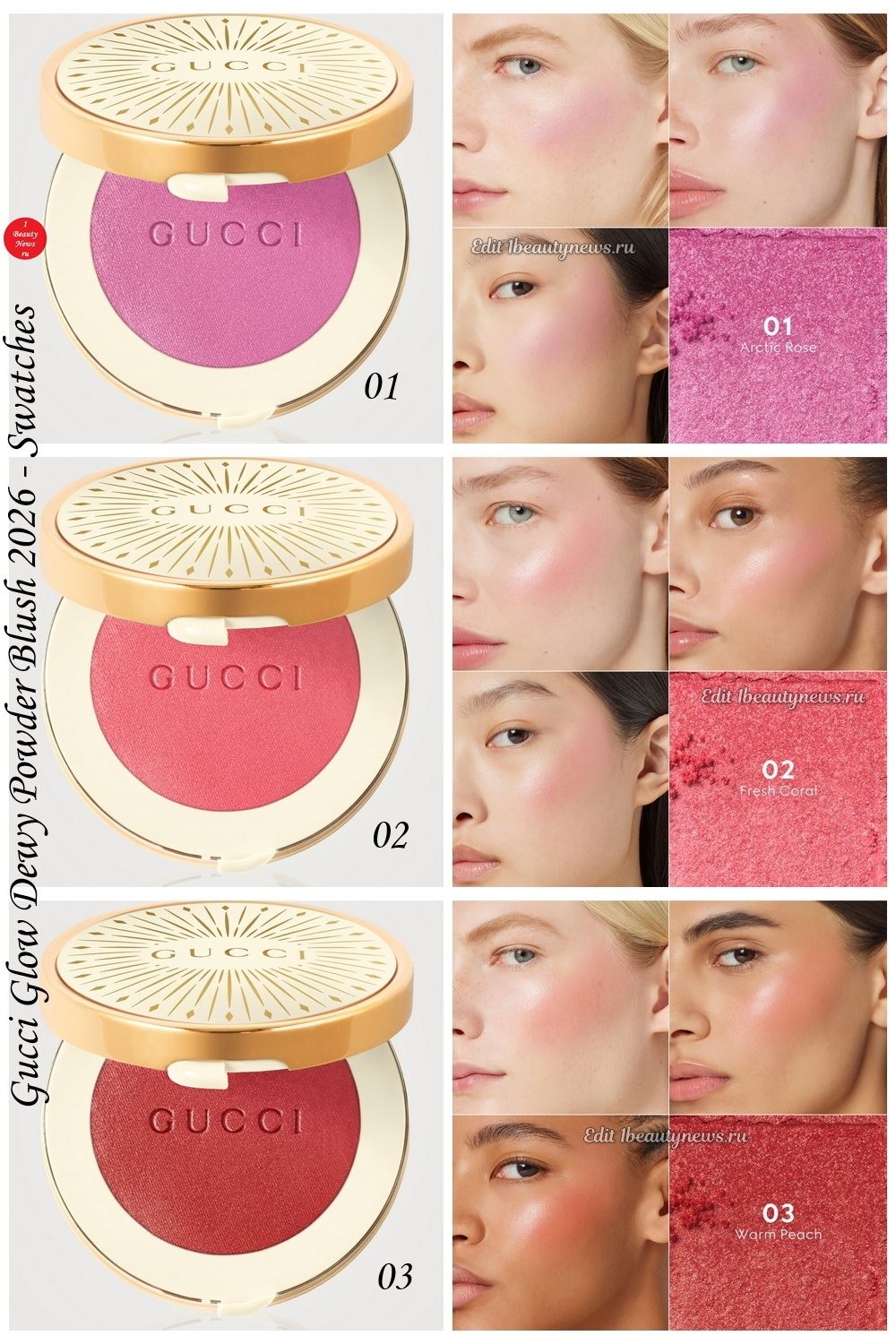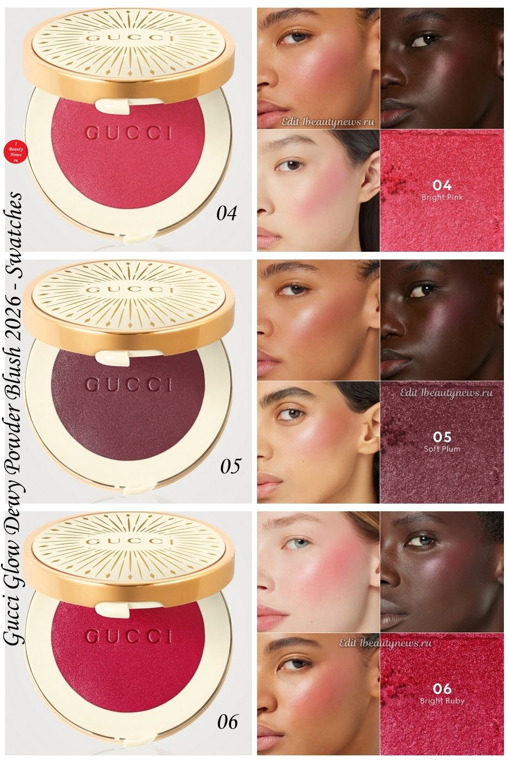 Промо-свотчи новых румян Gucci Glow Dewy Powder Blush 2026 — Swatches: