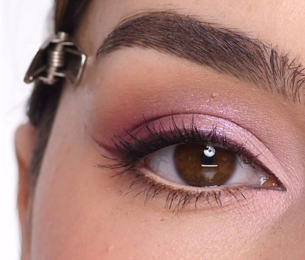 Не менее популярен вариант розового макияжа глаз со стрелкой: можно выбрать подводку черным или баклажановым оттенком.
