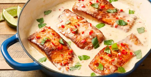 Обжарьте лосось до румяной корочки и временно уберите. В сковороду добавьте кокосовое молоко, натертый имбирь и соевый соус, доведите до легкого кипения. Верните рыбу, убавьте огонь и томите 5-7 минут. Перед подачей добавьте сок лайма.