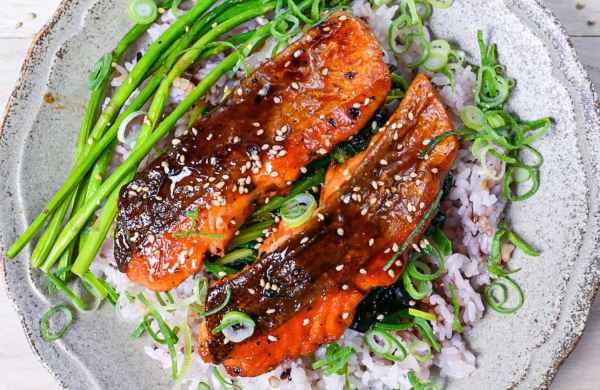 Обжарьте лосось на оливковом масле до готовности, затем влейте соус терияки и прогрейте рыбу, пока соус слегка не загустеет. Посыпьте кунжутом и зеленым луком перед подачей. Хорошо сочетается с рисом или овощами на пару.
