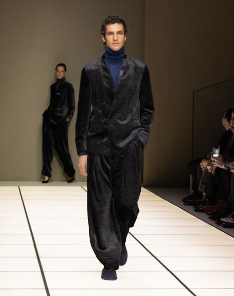 Среди материалов царила осмысленность фактур. Нарядный бархат с триумфом вернулся в коллекцию Giorgio Armani. Мягкий, с глубоким, благородным блеском, он лег в основу смокингов и брюк.