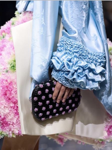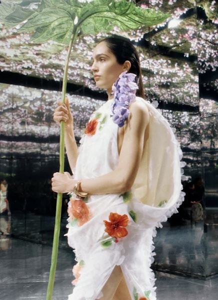 Dior В этом сезоне флористические мотивы выступили не только как принт, но и как основа силуэтов. Джонатан Андерсон представил на показе Dior «райский сад»: платья-бутоны с оборками-лепестками и вышивкой, сумки из гобелена с цветочными узорами, массивные серьги в форме гортензий и, конечно, подходящие к ним туфли.