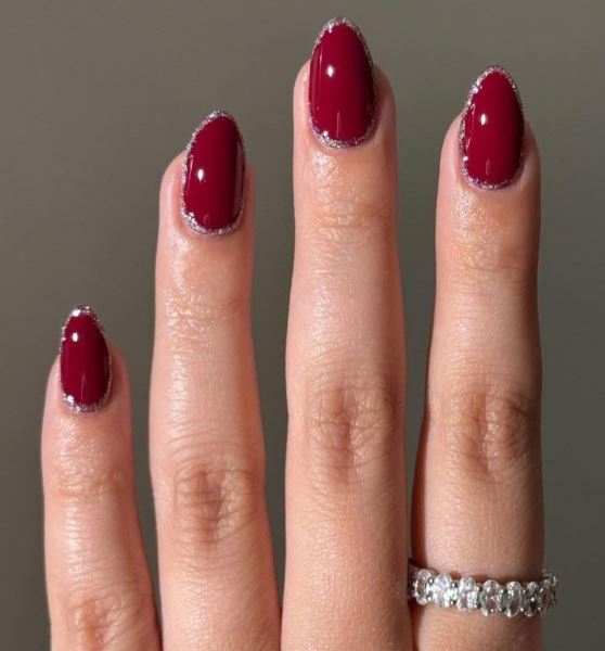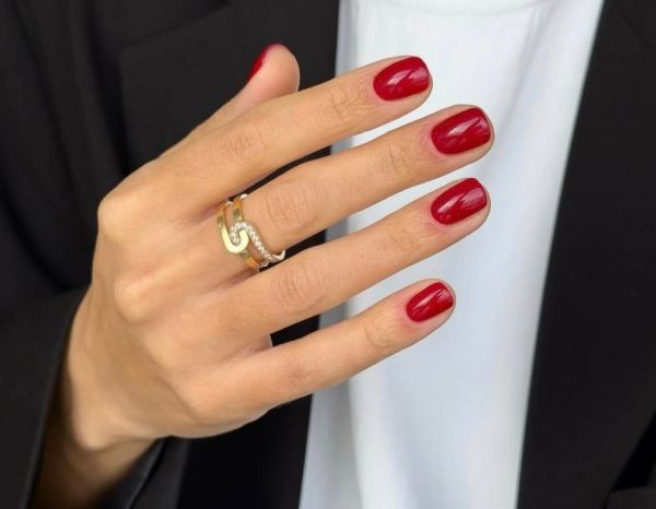 Для денежного маникюра в 2026 году предпочтителен темно-красный или бургунди в сольном исполнении, в сочетании с крупными аксессуарами или без них.