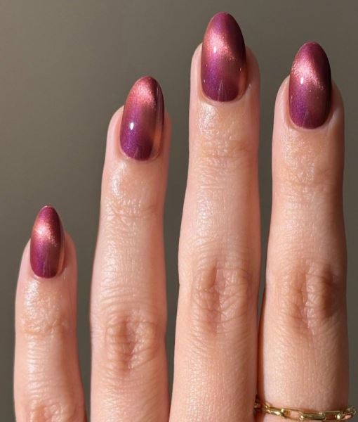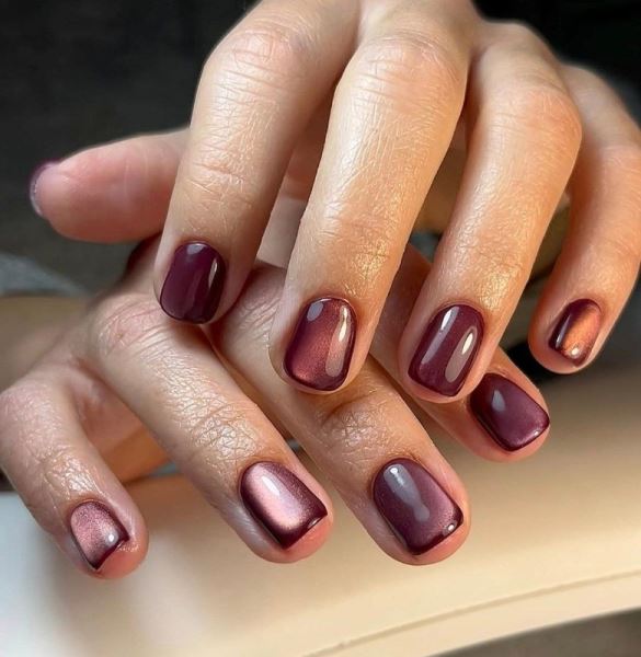 Как минимум до конца зимы будут очень популярны магнитные лаки с бархатным эффектом, поэтому отличное решение – выбрать сливовый маникюр «кошачий глаз».