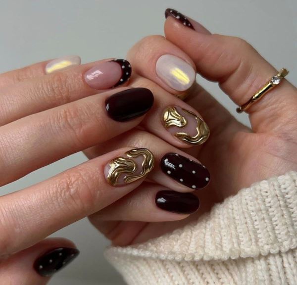 Используйте золото как акцент или основу для сложной графики. Идеальная техника – «жидкое золото»: эффект струящегося, неидеального металла на одном-двух ногтях.
